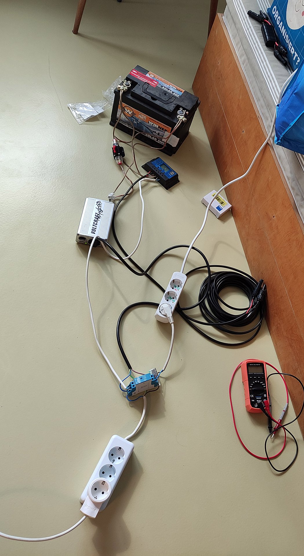Ich habe hier zum testen eine Autobatterie. Besser wäre, weil auch während dem Laden Volt und Ladezustand besser korrelieren, ein Lifepo4 Akku. Der Wechselrichter hier kann nur 150 Watt, je nachdem was man alles anschliessen will muss man hier passend dimensionieren.