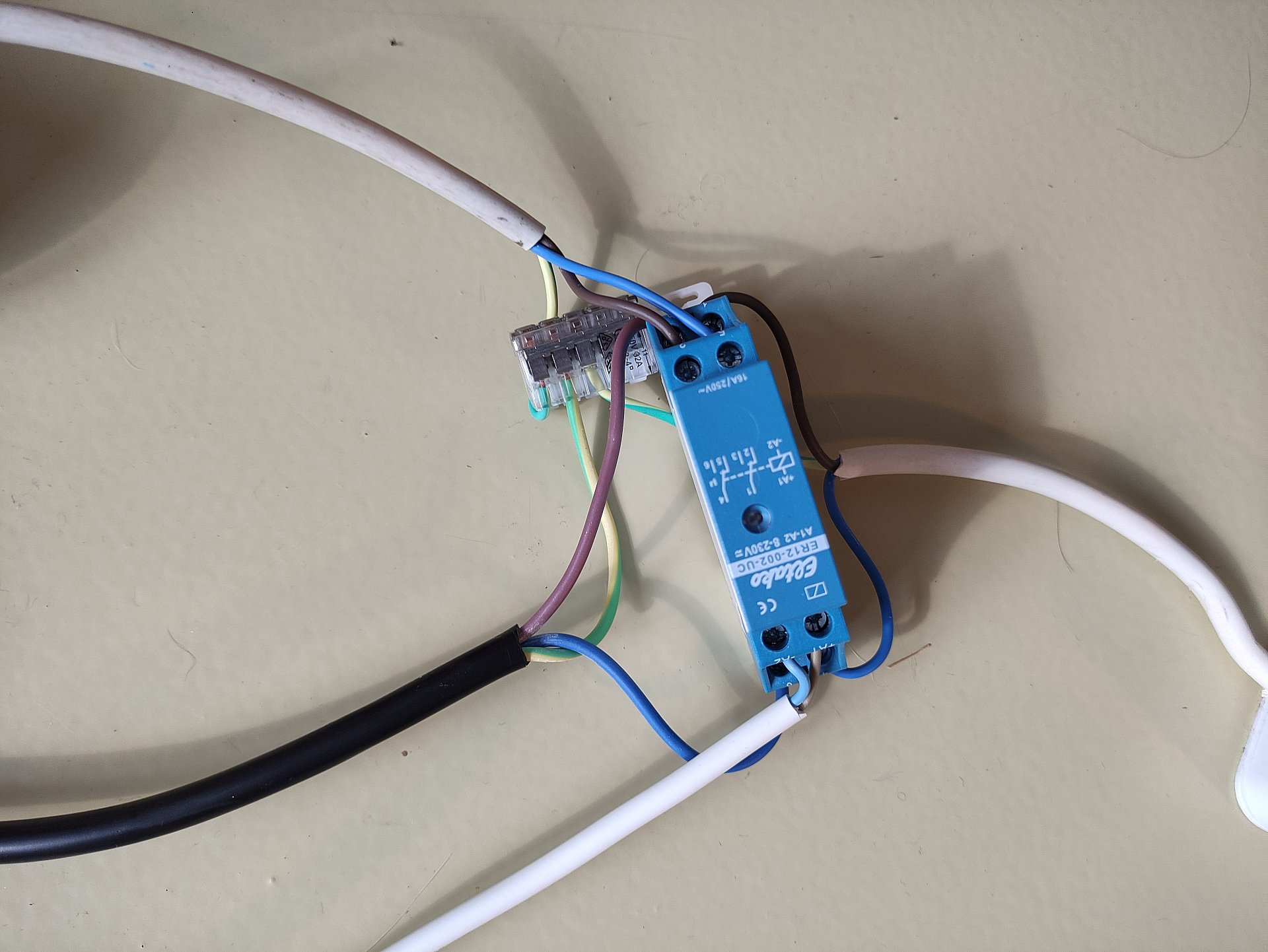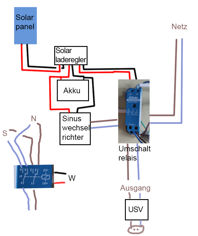 Von oben kommt das Netz, von Links (schwarz) Strom vom Wechselrichter, über das weisse Kabel unten schaltet der Laderegler mit 12 Volt um, rechts hängen die Verbraucher dran, die Erdung kommt vom Hausnetz. Fliessen 12 Volt vom Laderegler-Ausgang ist das Solarsystem auf Priorität, wenn nicht schaltet das Relais auf Netz um.